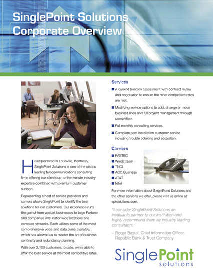 In the midst of rapid growth in the business-to-business segment, SinglePoint Solutions found themselves in need of a massive rebranding campaign. Beginning with the logo, we were able to bring SinglePoint into the 21st Century with a cutting edge design that stays true to the original brand. Updating all of there materials also gave them a chance to revise previously outdated copy with new figures, clients and testimonials.