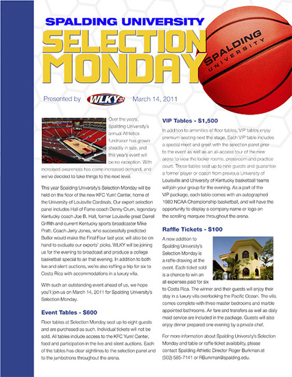 We began by branding the event Selection Monday. Staying true to the college basketball theme, Selection Monday was an ideal choice. And in an effort to create event more awareness for Spalding Athletics, we recommended moving to the event to the KFC Yum! Center and partnering with WLKY to broadcast Selection Monday throughout Metro Louisville.The highlight of the evening was listening to Hall of Fame Coach Denny Crum, Coach Joe B. Hall, and former UofL and UK greats Darrell Griffith and Mike Pratt give their expert picks for the 2011 NCAA Tournament.